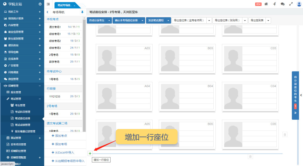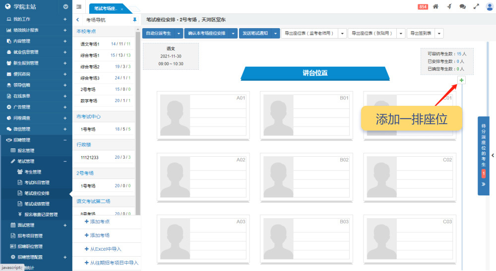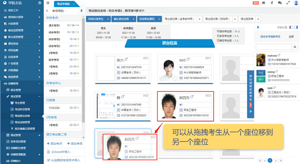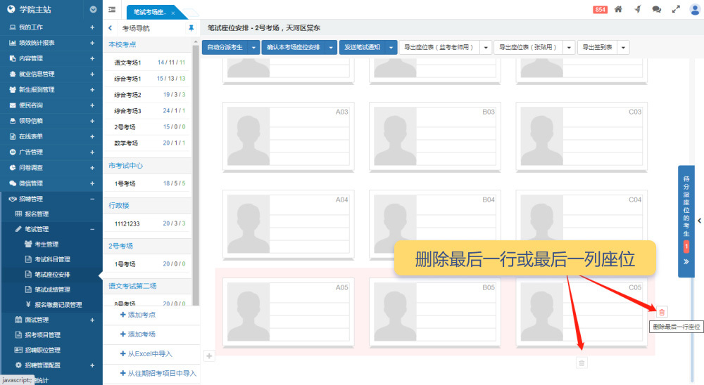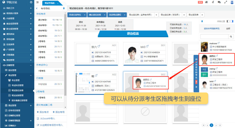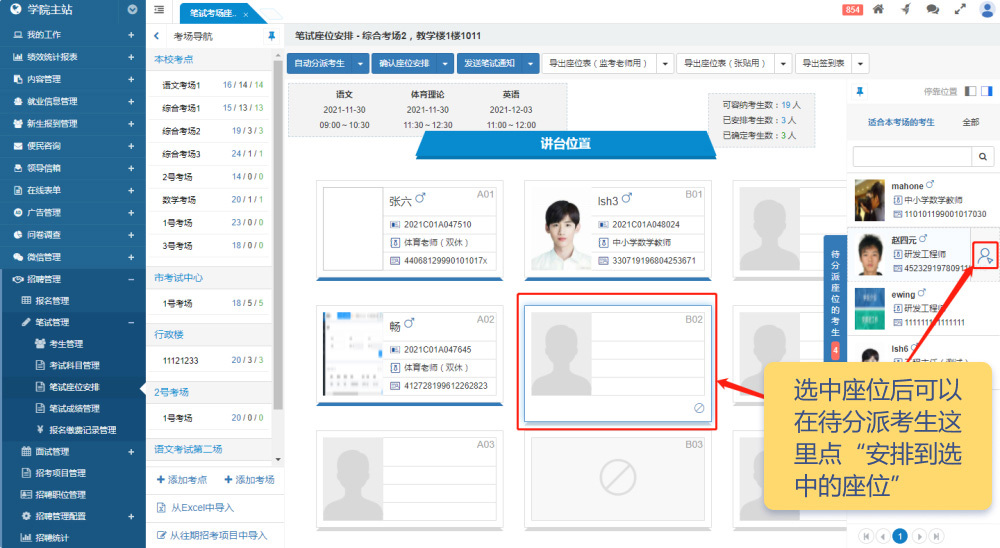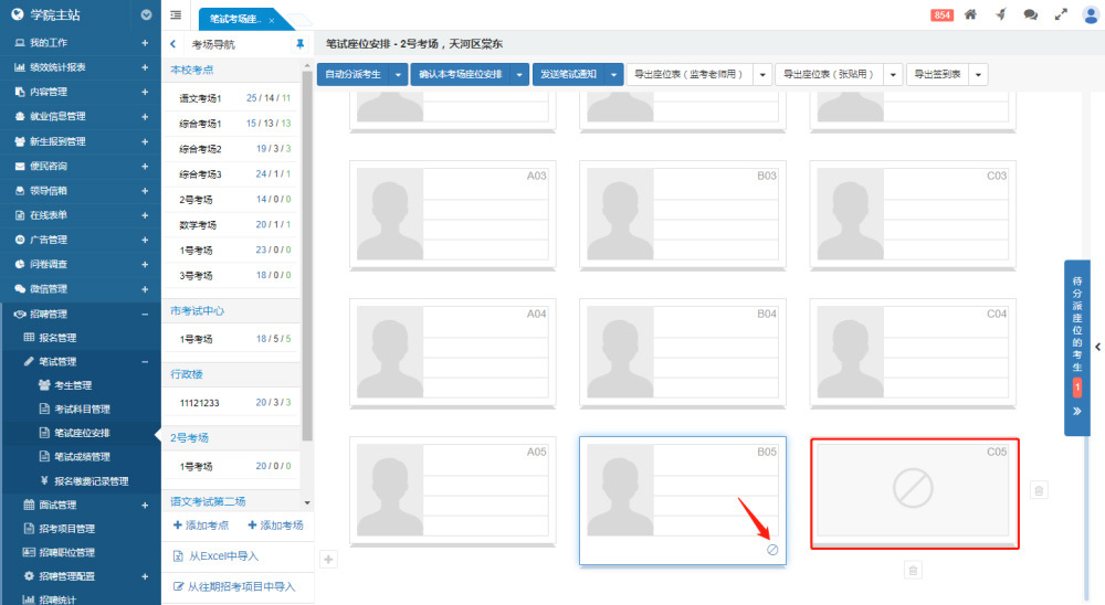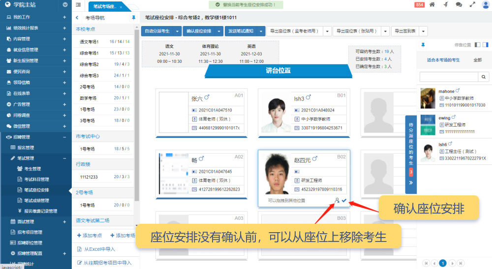 在后臺管理界面中,中欄顯示考點和考場導航信息。右側展示座位安排表,以所見即所得的方式顯示每個座位的考生信息。同時,右側還包含“待分派座位的考生”區(qū)域(僅在有待分派考生時顯示)。