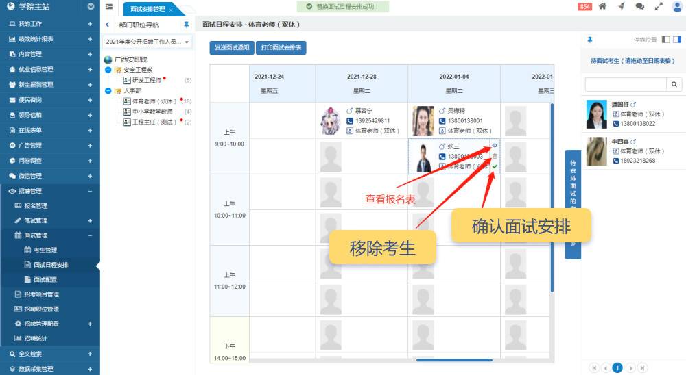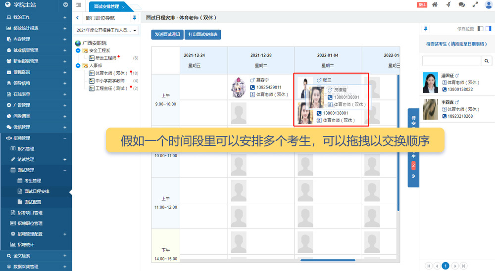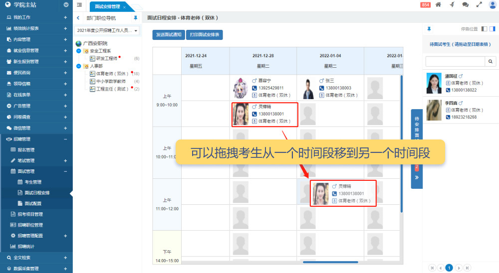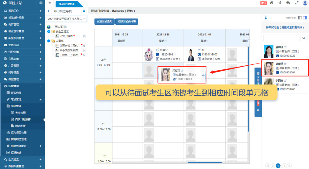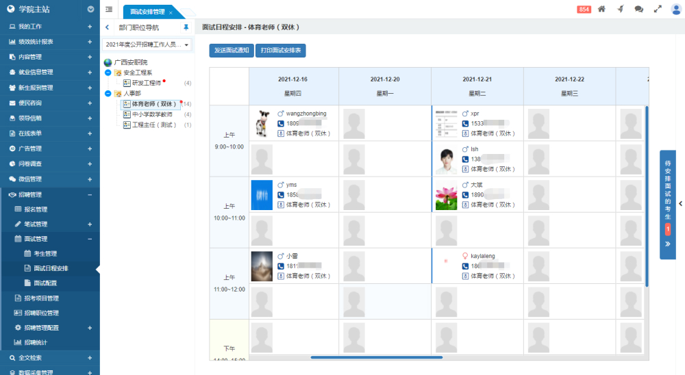 系統(tǒng)的中欄顯示本次招考項目的職位列表,每個職位名稱后標注進入面試流程的考生總數(shù)。若有“待安排面試時間”的考生,系統(tǒng)會以紅點提示。右側顯示待安排面試的考生列表,中間則為面試日程安排表。