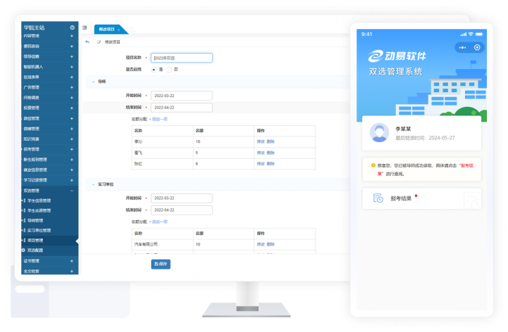 支持設(shè)置項(xiàng)目信息,包括設(shè)置項(xiàng)目的開(kāi)始時(shí)間和結(jié)束時(shí)間,以及學(xué)生可以選擇的導(dǎo)師和實(shí)習(xí)單位,以及相應(yīng)的名額。
