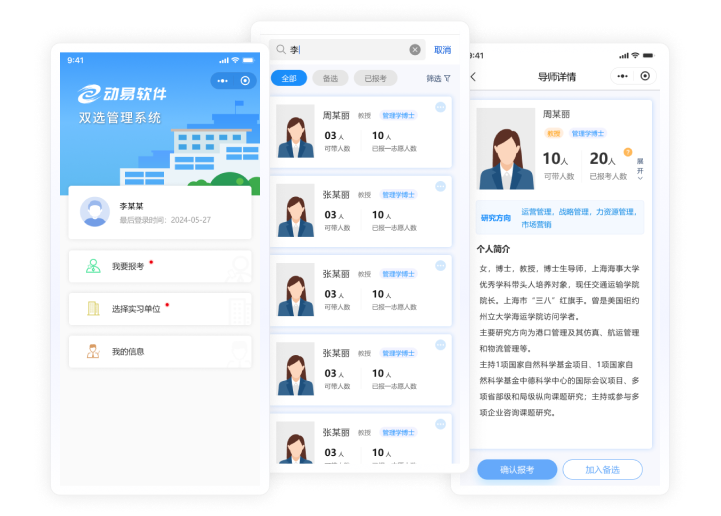 在小程序主頁(yè)點(diǎn)擊“我要報(bào)考”后,系統(tǒng)將展示導(dǎo)師列表,學(xué)生可以根據(jù)職稱(chēng)、學(xué)歷、研究方向等條件篩選導(dǎo)師。點(diǎn)擊導(dǎo)師名稱(chēng)可以查看其詳細(xì)信息以及報(bào)考該導(dǎo)師的相關(guān)數(shù)據(jù)。學(xué)生可以將導(dǎo)師加入備選或取消備選,并最終確認(rèn)報(bào)考。