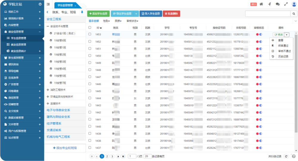 畢業(yè)生就業(yè)信息管理 畢業(yè)生就業(yè)信息管理畢業(yè)生通過小程序填報就業(yè)信息后,管理員可在后臺對提交的就業(yè)信息進行審核、修改、刪除操作。審核分初審與終審兩個階段:對應院系、班級管理員進行數(shù)據(jù)初審;校級管理員進行數(shù)據(jù)終審。若審核過程中發(fā)現(xiàn)信息不符合要求,可通過微信向畢業(yè)生發(fā)送通知進行修改并重新提交。 此外,班主任(輔導員)登錄系統(tǒng)后可查看其負責的班級信息,查看、修改、審核畢業(yè)生的就業(yè)信息。