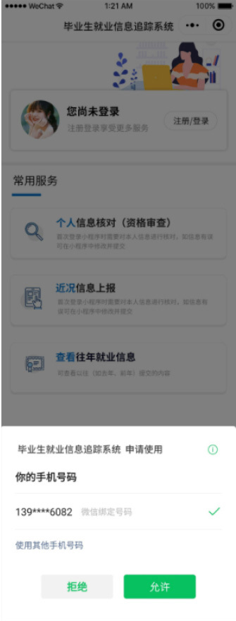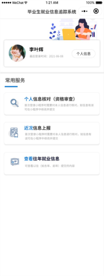 就業(yè)信息上報小程序,讓畢業(yè)生隨時隨地上報就業(yè)信息學生端采用微信小程序?qū)崿F(xiàn)就業(yè)信息的便捷上報。班主任通過 QQ、微信、手機短信及郵件等多種通訊渠道發(fā)送通知,畢業(yè)生在收到通知后僅需掃描通知中的二維碼,通過微信快速授權(quán)登錄,即可隨時隨地輕松完成就業(yè)信息的填報,極大地提升了信息上報的效率。