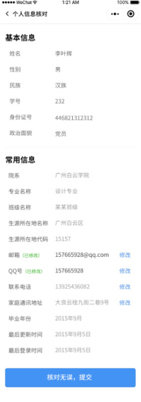 畢業(yè)生個人信息核對支持畢業(yè)生對本人信息進行核對,如信息有誤可在小程序中修改并提交,院系用戶或輔導員(管理員)將對提交信息進行數(shù)據(jù)審核,系統(tǒng)將自動記錄修改的具體字段及展示修改前后的內(nèi)容對比,以確保數(shù)據(jù)更新的準確性和可追溯性。