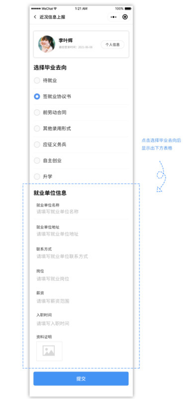 畢業(yè)生就業(yè)信息上報 畢業(yè)生就業(yè)信息上報畢業(yè)生根據(jù)自身實際情況,在小程序中選擇當前狀態(tài)(待就業(yè)、簽就業(yè)協(xié)議書、簽勞動合同、其他錄用形式、應征義務兵、自主創(chuàng)業(yè)、升學),小程序根據(jù)所選狀態(tài)提供不同的表單、選項供畢業(yè)生填寫。 在開放數(shù)據(jù)上報期間,畢業(yè)生可隨時修改個人畢業(yè)去向和就業(yè)信息,校級用戶與院系用戶可查看學生修改數(shù)據(jù)內(nèi)容的前后對比與修改時間。