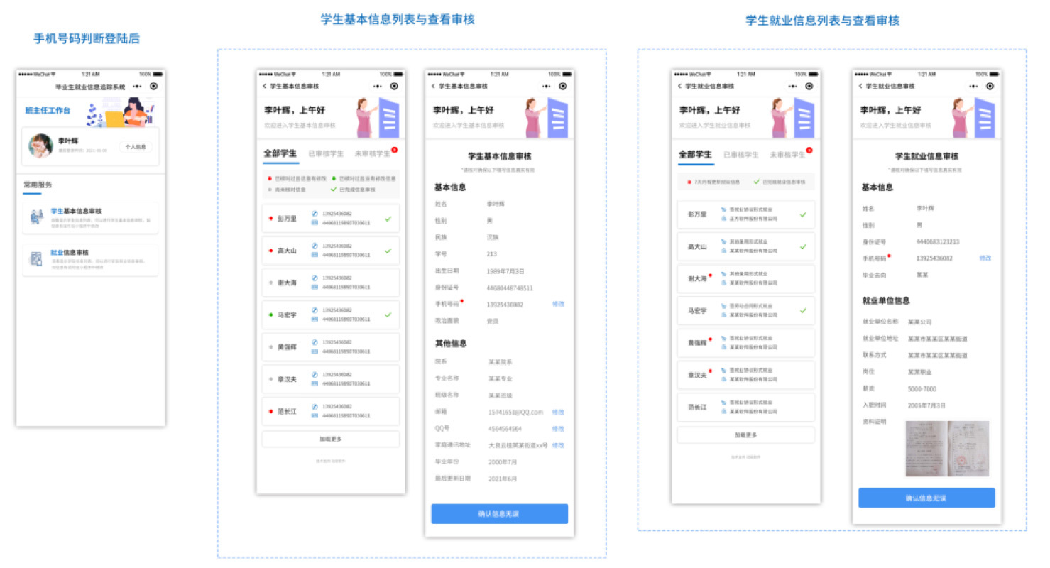 班主任工作臺小程序,讓班主任隨時隨地可以審核學生就業(yè)信息班主任端也采用小程序方式。班主任(輔導員)通過掃描二維碼進入小程序,小程序自動申請獲取當前微信賬號綁定的手機號進行身份驗證,識別并確認班主任身份后,直接進入班主任工作臺界面,即可進行學生基本信息的審核以及畢業(yè)生就業(yè)信息的核驗工作,整個過程流暢自然,方便快捷。