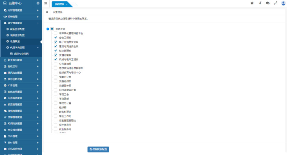 院系、專業(yè)、班級管理 院系、專業(yè)、班級管理院系為全局部門的子集,可以配置全局部門中在就業(yè)信息管理模塊中啟用的部門做為院系。 系統(tǒng)支持對專業(yè)及班級信息的添加、刪除、修改、查看及篩選操作。 支持從導入的畢業(yè)生信息中,自動識別專業(yè)、班級在此新生報到項目是否存在,如不存在則自動創(chuàng)建;支持自動識別院系,并與系統(tǒng)院系(全局部門)信息關(guān)聯(lián)。 班級創(chuàng)建完成后,支持為班級設置一名班主任(后臺管理員賬號)。