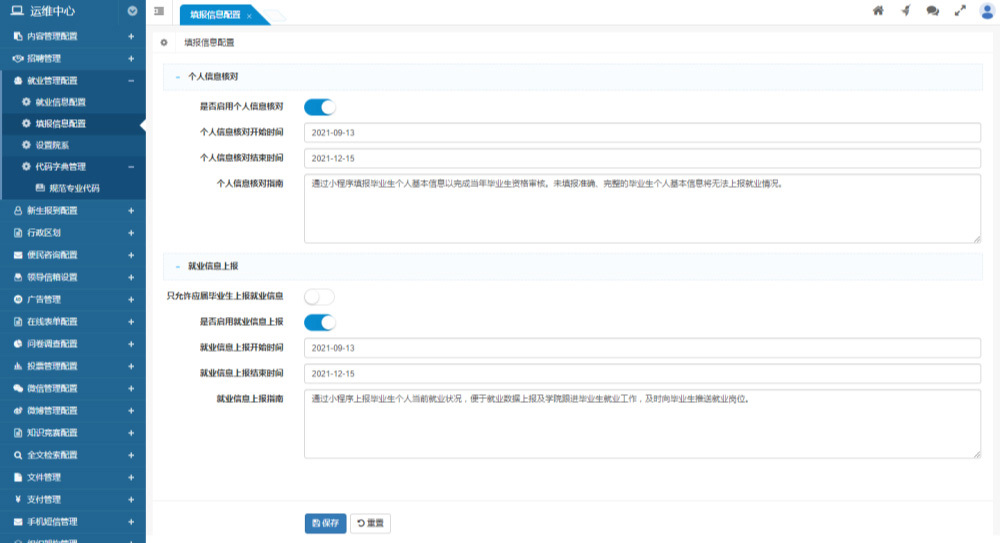 畢業(yè)生信息上報配置 畢業(yè)生信息上報配置支持設置是否開放個人基本信息核對、信息核對的開始時間、截止時間、信息核對小程序頁面中的指南性文字描述等內(nèi)容。 支持設置是否開放信息上報、信息上報的開始時間、截止時間、信息上報小程序中的指南性文字描述等內(nèi)容。
