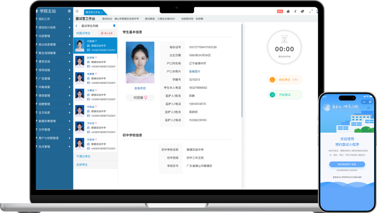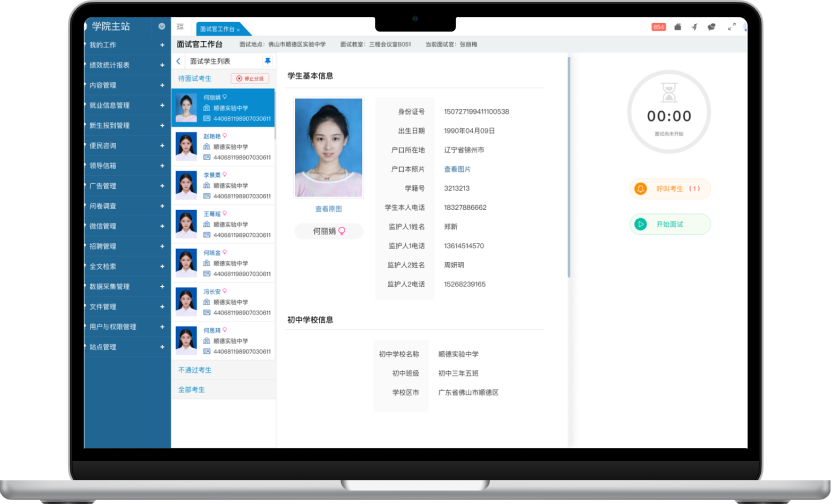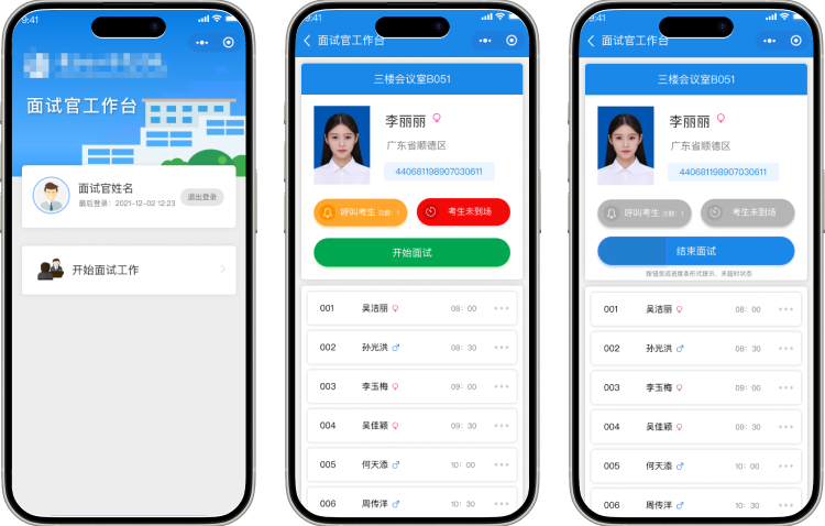 面試官工作臺(tái)支持叫號(hào)、考生未到場(chǎng)處理、開(kāi)始面試、結(jié)束面試、錄入面試結(jié)果等操作,并提供倒計(jì)時(shí)及超時(shí)提醒功能。