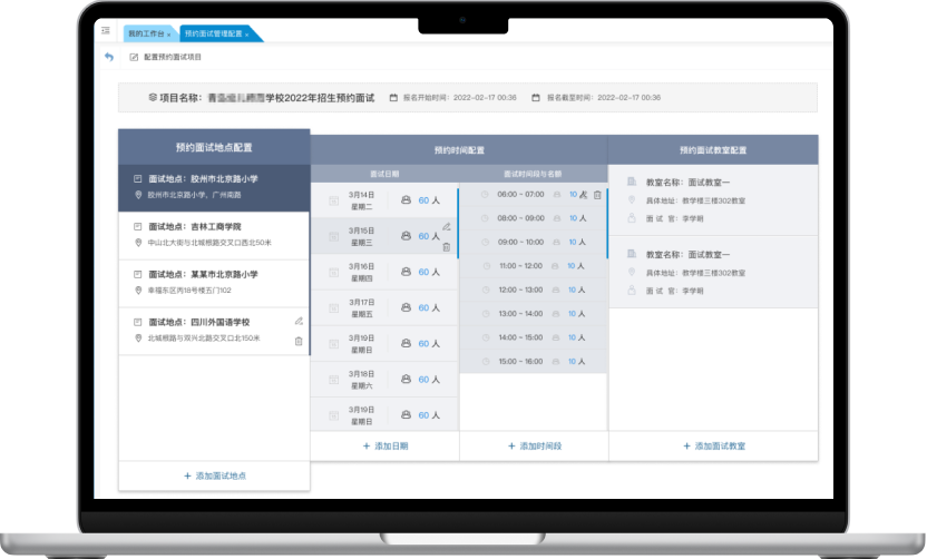 可配置每位考生的面試時(shí)長(zhǎng),并設(shè)定面試項(xiàng)目的地點(diǎn)、日期、時(shí)間段、面試教室和面試官等參數(shù)。
