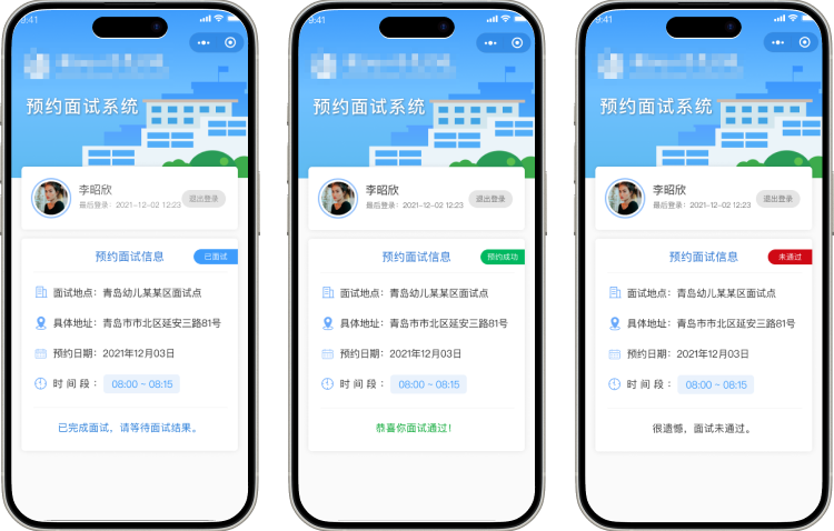 系統(tǒng)在預(yù)約面試日期前三天、前一天、預(yù)約當(dāng)天,以及預(yù)約時(shí)間段的前3小時(shí),分別發(fā)送提醒通知,確保考生按時(shí)到達(dá)面試現(xiàn)場(chǎng)。
