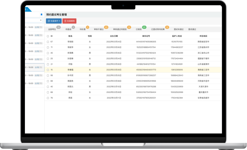 預(yù)約面試系統(tǒng)相比招考管理系統(tǒng),減少了組織筆試相關(guān)的功能模塊(如科目管理、考點(diǎn)管理、考場(chǎng)管理、座位管理、座位安排、筆試成績(jī)錄入等),也沒(méi)有面試日程表功能。但它增加了考生報(bào)到、查看排隊(duì)情況、以及叫號(hào)大屏幕等功能,專(zhuān)門(mén)針對(duì)大規(guī)模人員面試業(yè)務(wù)場(chǎng)景的需求進(jìn)行了優(yōu)化。