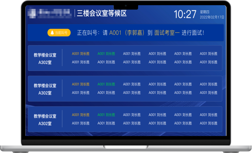 類(lèi)似醫(yī)院的候診大屏幕設(shè)計(jì),系統(tǒng)設(shè)計(jì)了專(zhuān)門(mén)的叫號(hào)大屏幕,實(shí)時(shí)展示并播報(bào)正在叫號(hào)的考生信息,同時(shí)顯示各面試教室中已排隊(duì)考生的序號(hào),方便考生及時(shí)到達(dá)指定面試教室等候面試。
